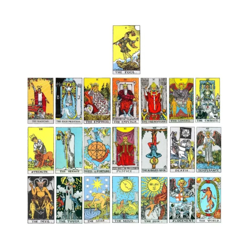 • Arkana Wielkie Tarota – w skład których wchodzą 22 karty przedstawiające różne archetypiczne wizerunki (np. takie jak Cesarz, Kochankowie czy Księżyc),